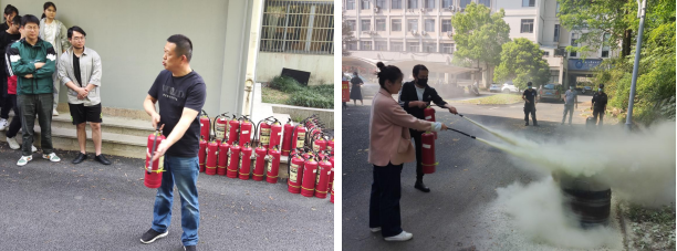 宣讲会后组织师生观看消防知识图板,为进一步强化师生的安全意识和应急处置能力,还举行了实验室消防安全演练,治安科主管蒋行军老师现场介绍了消防器材的使用方法和操作要领,并指导现场人员使用灭火器开展实战演练。