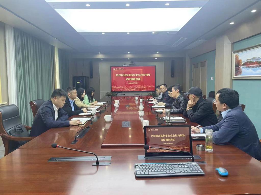 5月12日,杭州市农业农村局(杭州市乡村振兴局)胡杰华巡视员一行来校调研杭州市农业农村发展工作,科技处、文科处、省乡村振兴研究院等部门负责人参加座谈交流。