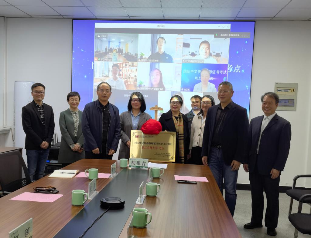 11月25日下午,国际中文传播教师证书考试浙江农林大学考点揭牌仪式以线上线下相结合方式举行。中国外文局教育培训中心教研室主任宋晓媛,副校长胡祖吉出席仪式。国际中文传播教师考试委员会委员、教授高海洋,国际中文传播教师证书考试办公室项目推广负责人康雷,国际教育学院相关负责人,文法学院院长鲁可荣,党委书记朱红东,外国语言文学学科负责人张晶,中国语言文学学科负责人储小旵等参加了揭牌仪式。