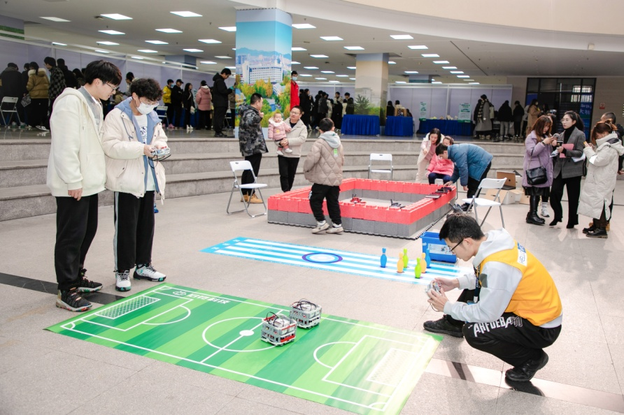 活动现场,师生们开展了创新创业展示、校企合作展示、团学活动展示、生态节能KT板展示四大活动板块。有无人机、树木胸径测量卡尺、乐高机器人、小E机器人互动展示,也有VR互动、现场代码转换二维码互动,以及团学各部门准备的趣味小游戏活动。让师生们更加深入地了解数智文化、体验数智文化、参与数智文化,同时也更加深入的了解人工智能在服务生态、节能节水方面的新技术。