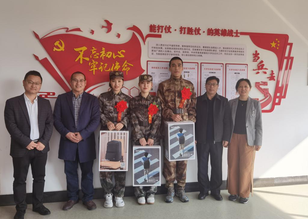 人武部负责人为入伍新兵佩戴红花、发放纪念品,并对3名入伍大学生表示衷心的祝贺。并叮嘱入伍新兵要服从命令、听从指挥、忠于职守、苦练军事技能;要牢记军人使命,发扬学校精神,冲锋在前、吃苦在前;要继承优良传统,锤炼意志品德,不怕困难、不怕牺牲;要争做“四有”军人,为国为校争光,学校等待着大家捷报频传。学院相关负责人希望入伍学生不忘初心、奋勇争先,做一名能打仗、打胜仗的英勇战士。