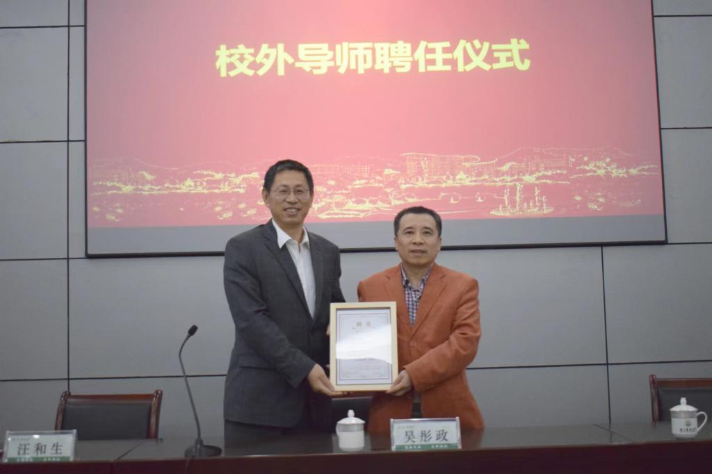 报告会上举行了校外实践导师聘任仪式,学院党委书记汪和生为吴彤政颁发证书。
