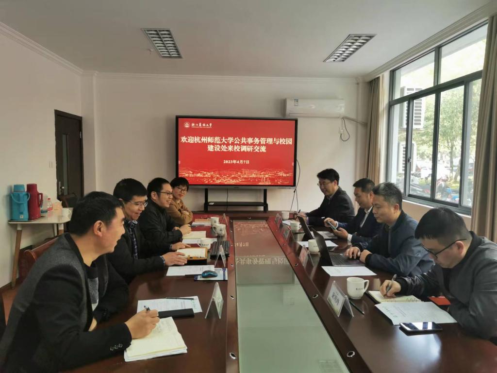 4月7日,杭州师范大学公共事务管理与校园建设处副处长、资产经营有限公司总经理王锡渡一行来校调研交流,公管处、基建处、继教学院相关负责人陪同调研。