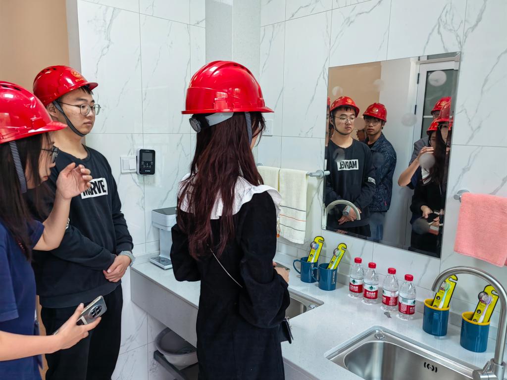 基建处负责人向大家介绍了学生宿舍扩建工程项目概况和样板间装修情况。学生代表们针对房间布局、装修标准、材料选用和使用便利性等方面用心体验观摩,对新建学生宿舍的空间布局、卫生间干湿分离、装修风格以及家具设计等方面表示了充分的认可,并对淋浴间物理通风换气设计、插座设置、脸盆摆放等细节考虑给予了充分的肯定,纷纷表示,这些细节处处体现着学校的用心和温暖。