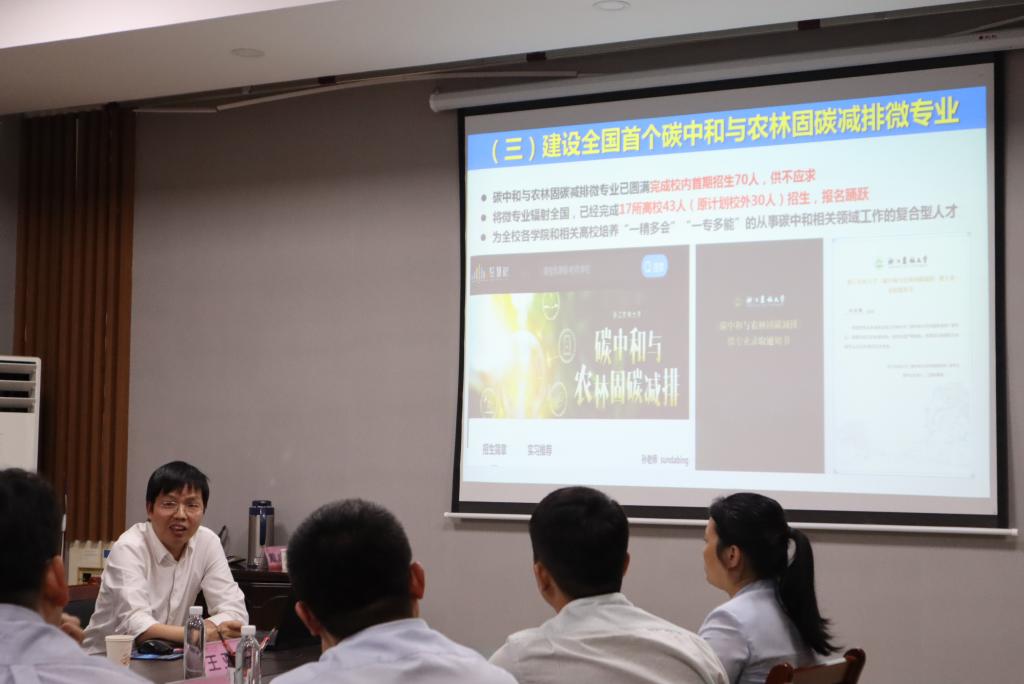 座谈会上,我校碳中和学院相关负责人以浙江农林大学碳中和学院为蓝本,从建设依据、建设思路、建设基础和初步成效四个方面做了主题报告。报告指出,碳中和学院自2022年9月24日成立以来,建设了碳中和与农林固碳减排微专业,吸引了本校70人和国内17所高校学生选学;从0-1新建《增汇减排技术与应用》《碳汇计量与监测》两门线上课程,目前已选课学校184所校次3054人学习;凝练了一批农林固碳减排技术;产生了一批有影响力的助力“双碳”社会服务典型案例,相关事迹被200多个媒体报道;基于嵊州市贵门乡GEP核算转化获批浙江省高校校企地党建联建典型案例。
