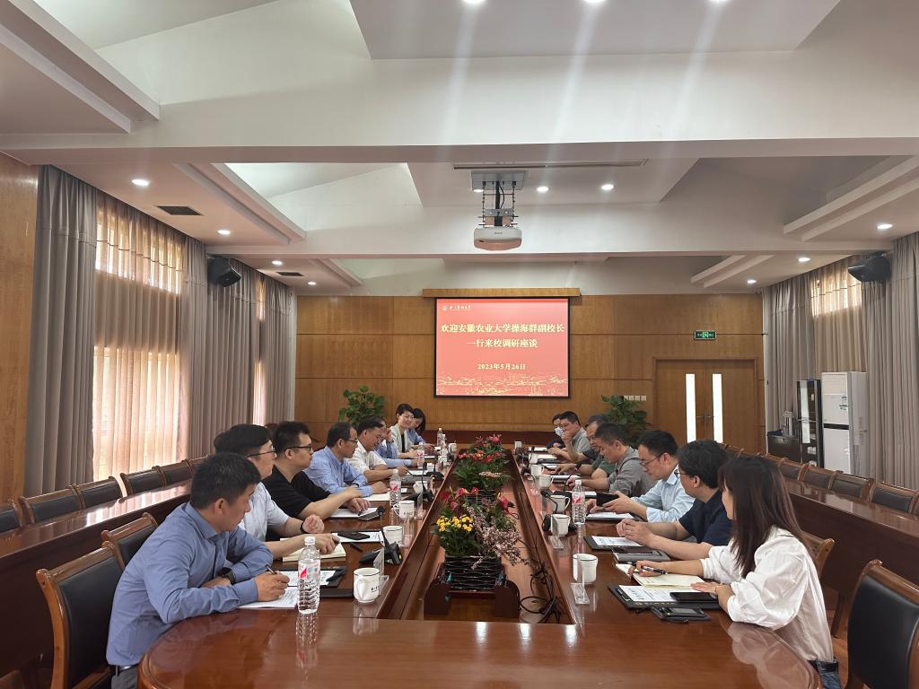 5月26日,安徽农业大学副校长韩军、操海群一行来校调研交流。科技处处长柳丹、信息中心主任莫路锋,以及规划处、人事处、文科处、合作处、基建处、后勤服务中心等部门相关负责人陪同调研。