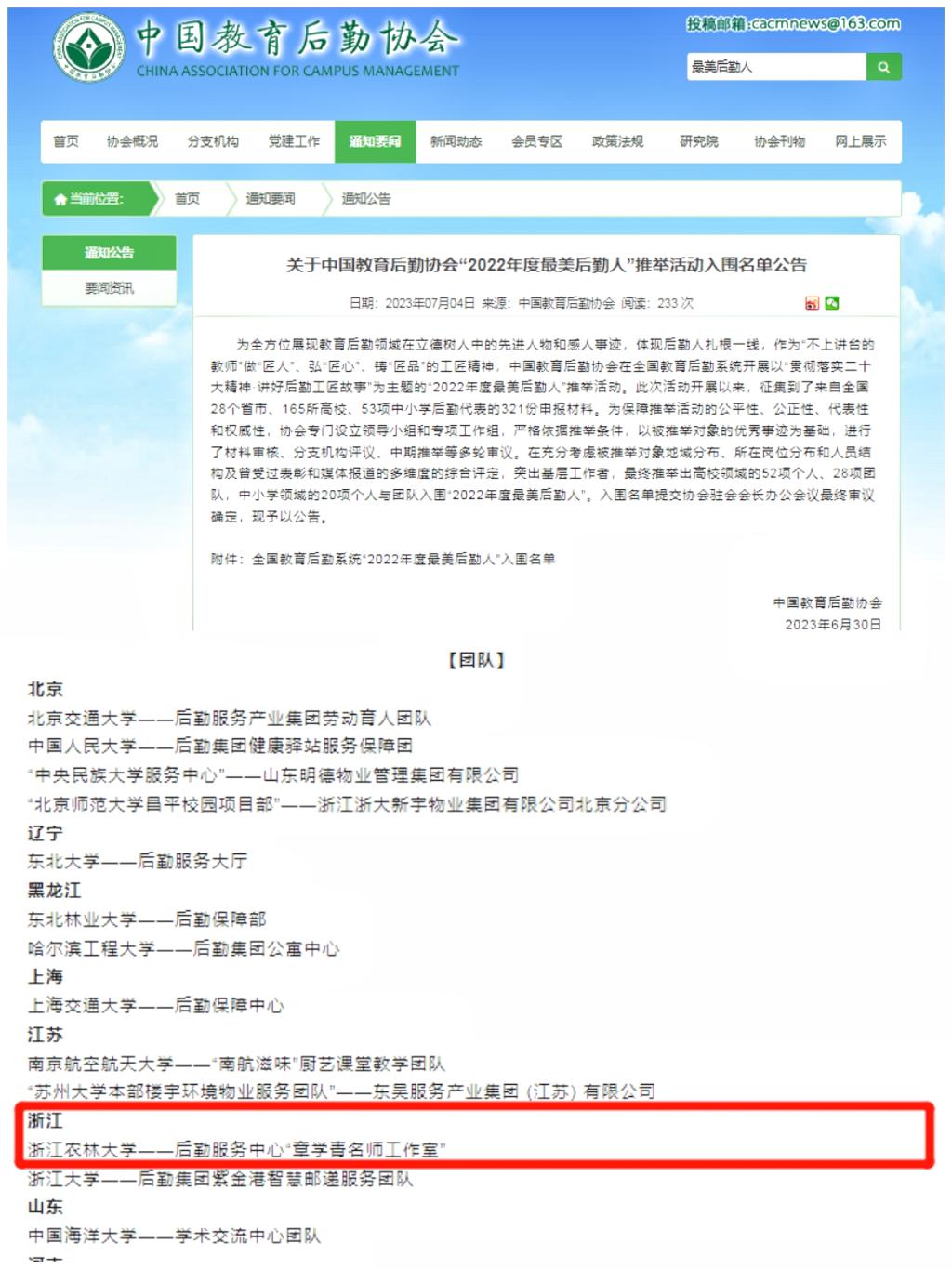 中国教育后勤协会传来喜报,在全国教育后勤系统开展的以“贯彻落实二十大精神·讲好后勤工匠故事”为主题的“2022年度最美后勤人”推举活动中,我校后勤服务中心“章学青名师工作室”荣获团队奖。