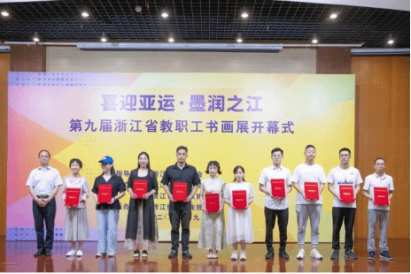 日前,“喜迎亚运·墨润之江”第九届浙江省教职工书画展开幕式在浙江经贸职业技术学院举行。省教育工会主席王玉庆、副主席李茜,省教育书法协会会长黄建新等出席开幕式。