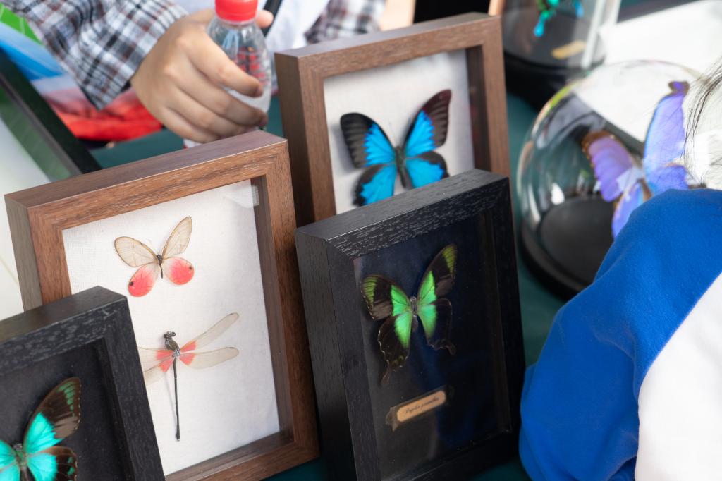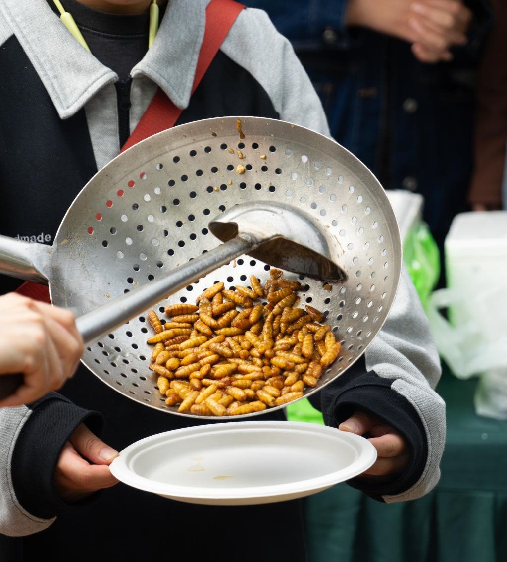 昆虫美食展采用了现场烹饪制作的方式,场地上架起了大锅。美食种类丰富,有蜂蛹、蝗虫、蚕蛹、金蝉、竹笋虫、竹虫、斗米虫等多种可以食用的美味昆虫。现场备有盘子、竹签、蘸料,并设有相应的昆虫科普标牌。同学们在享受舌尖美味的同时,更是体会到了别具一格的昆虫文化。昆虫标本及工艺作品展展示了学校昆虫标本馆部分馆藏标本、昆虫标本创意制作大赛历届获奖作品、学生的昆虫创意作业,包括手工、刺绣、标本、模型等。