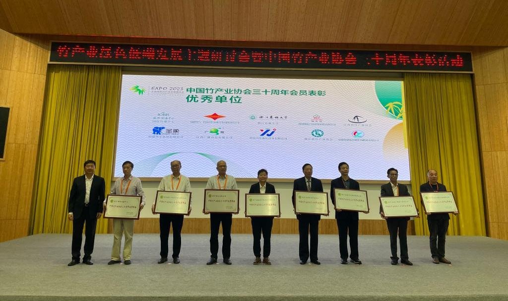 会上举行了隆重的表彰仪式,浙江农林大学被评为中国竹产业协会三十周年优秀单位,竹子研究院相关负责人代表学校领奖。