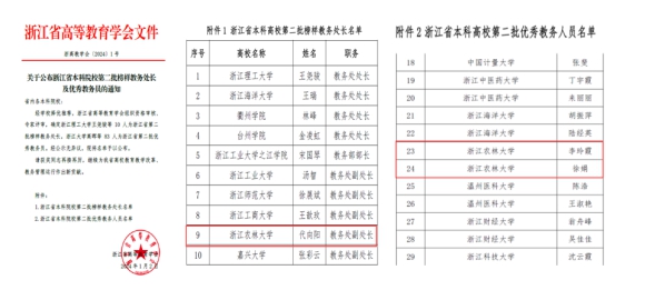 近日,浙江省高等教育学会印发了《关于公布浙江省本科院校第二批榜样教务处长及优秀教务员的通知》(浙高教学会〔2024〕1号 ),我校代向阳老师被评为第二批榜样教务处长,徐娟老师和李玲霞老师被评为优秀教务人员。
