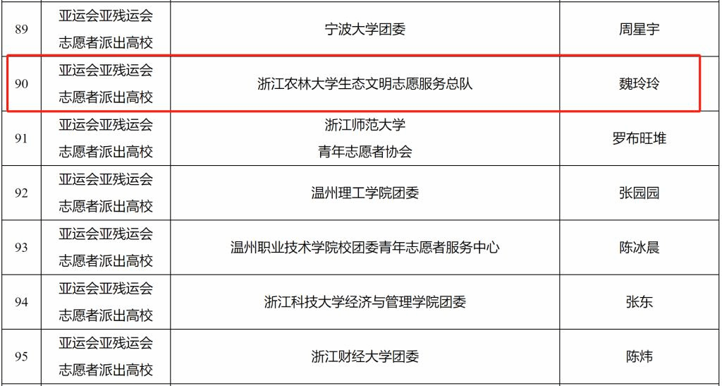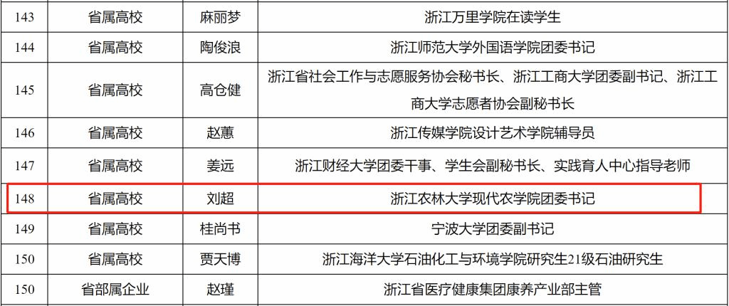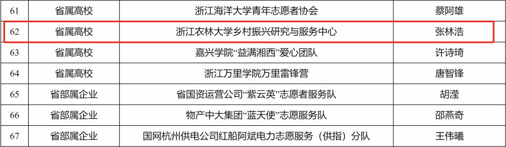 近日,共青团浙江省委、浙江省志愿者协会公布2023年度浙江省志愿服务工作突出贡献集体和突出贡献个人通报表扬名单,我校生态文明志愿服务总队、乡村振兴研究与服务中心荣获突出贡献集体荣誉称号,校团委委员、现代农学院团委书记刘超荣获突出贡献个人荣誉称号。