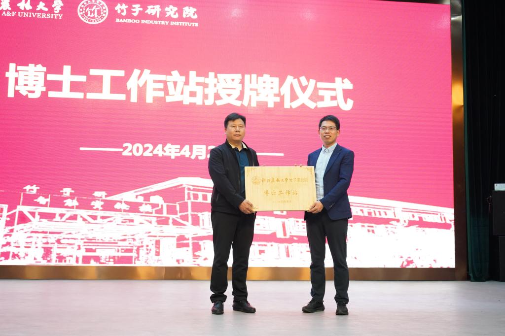 主题党日活动中,竹子研究院与安吉刘家塘村、安吉竹境竹业科技有限公司分别举行了“竹子研究院博士工作站”“研究生实践实训基地”授牌仪式。