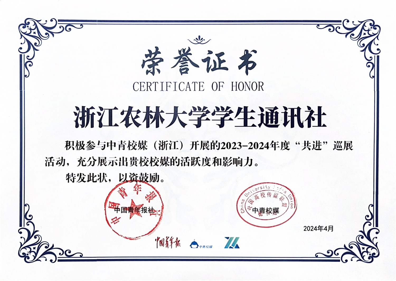 4月27日,由中国青年报社指导,中青校媒(浙江)主办的2024年度中青校媒(浙江)年会在中国美术学院(象山校区)召开。来自浙江传媒学院等25家校园媒体参加此次活动。浙江农林大学学生通讯社融媒体中心官微工作室部长倪官东等参加会议。会上表彰了10个浙江省“2023-2024年度影响力校媒”,我校学生通讯社脱颖而出、荣列其中。