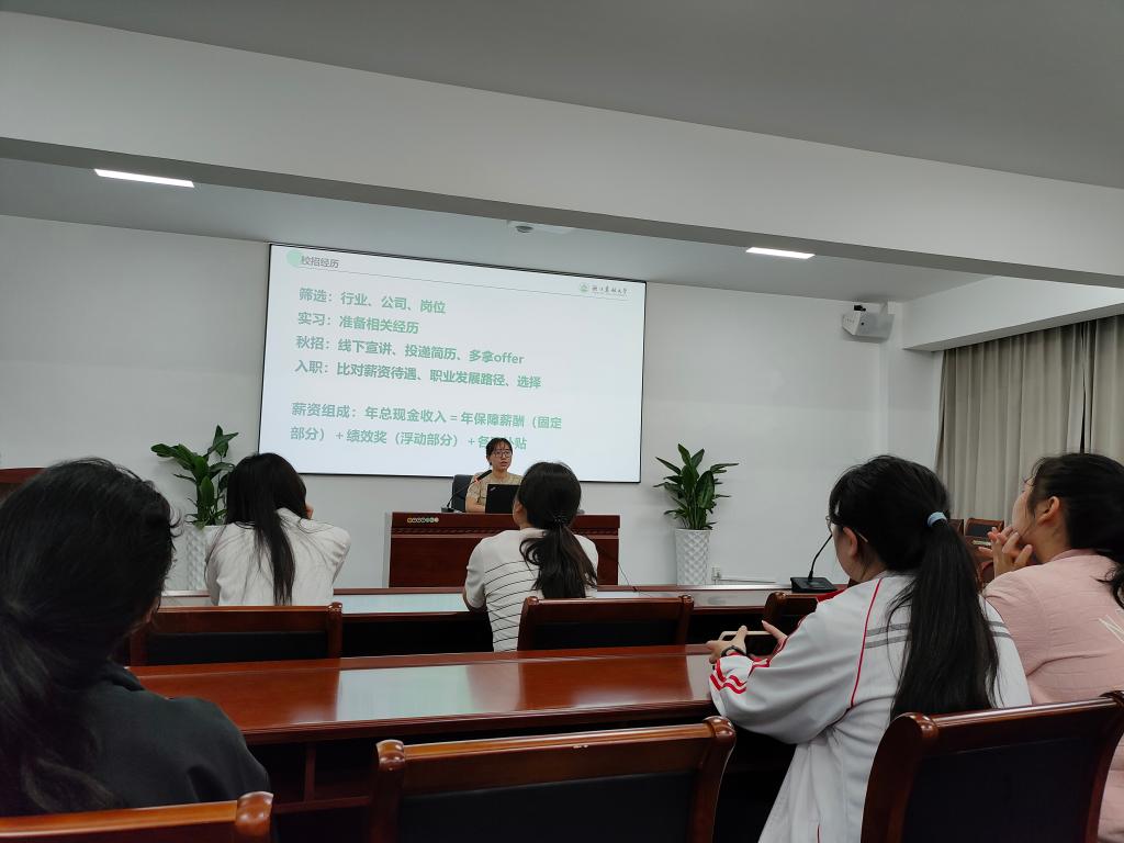 活动中,石忆潇向同学们分享了自己职业梦想的形成、求职和实习经历,以及从职场“小白”奋斗并荣获23年度华东区商业“新人成长奖”的职场感悟,她鼓励同学们积极参与实习实践、不断提升职业技能、勇于追求职业理想,她还和同学们进行了友好互动,从自己在多个单位的实习经历为切入点,分享了求职过程中应展示出的职业能力和素养。