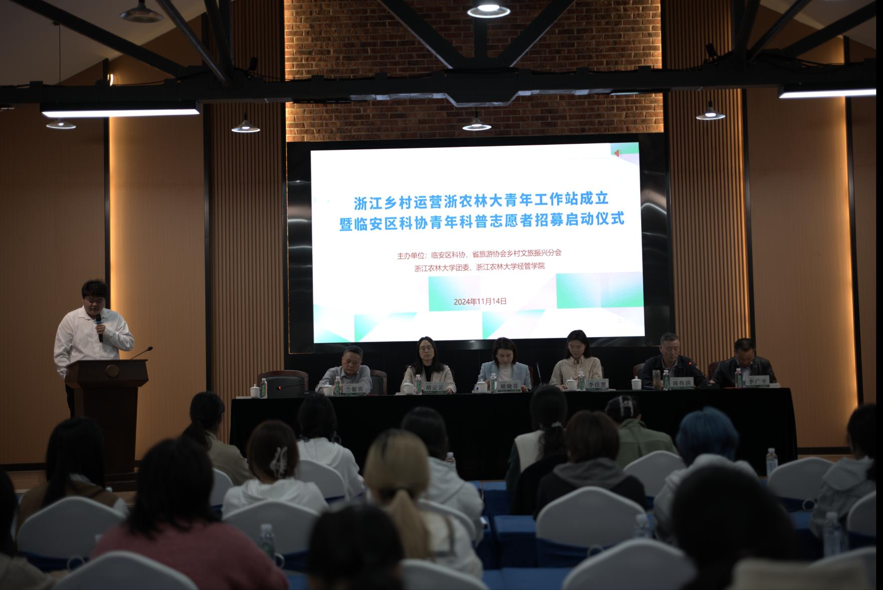 11月14日,浙江乡村运营浙农林大青年工作站成立仪式暨区科协青年科普志愿者招募启动仪式在浙江农林大学衣锦校区印象农林大讲堂内举行。此次成立仪式由浙江农林大学校团委、经管学院主办。浙江省旅游协会乡村文旅振兴分会会长陈伟宏,临安区科协书记兼主席顾晓芬,临安区科协副主席兰银宾以及校乡村振兴促进处、团委、经管学院等部门负责人出席活动。近百名热衷于乡村发展的社团成员及学生参加活动。