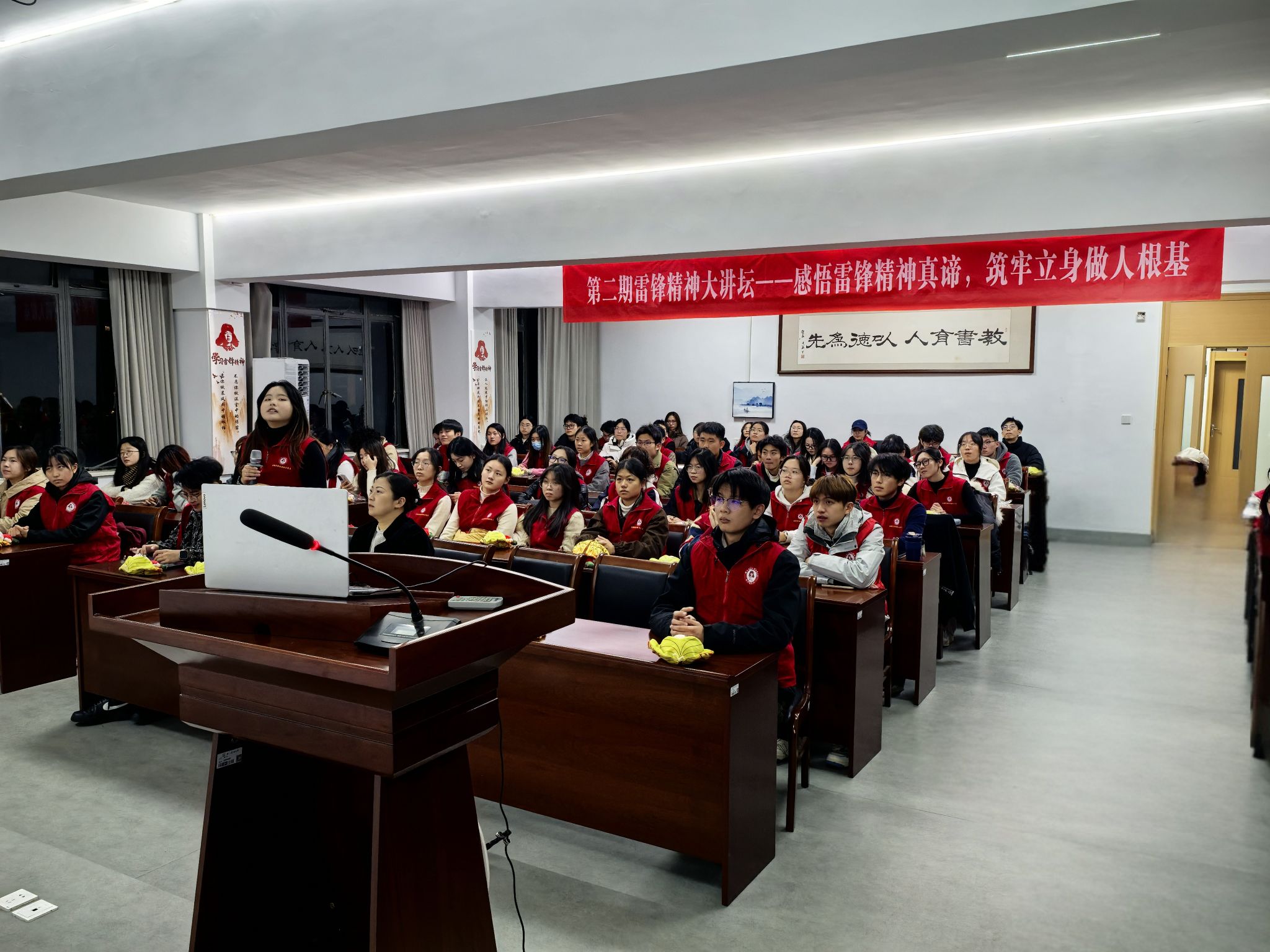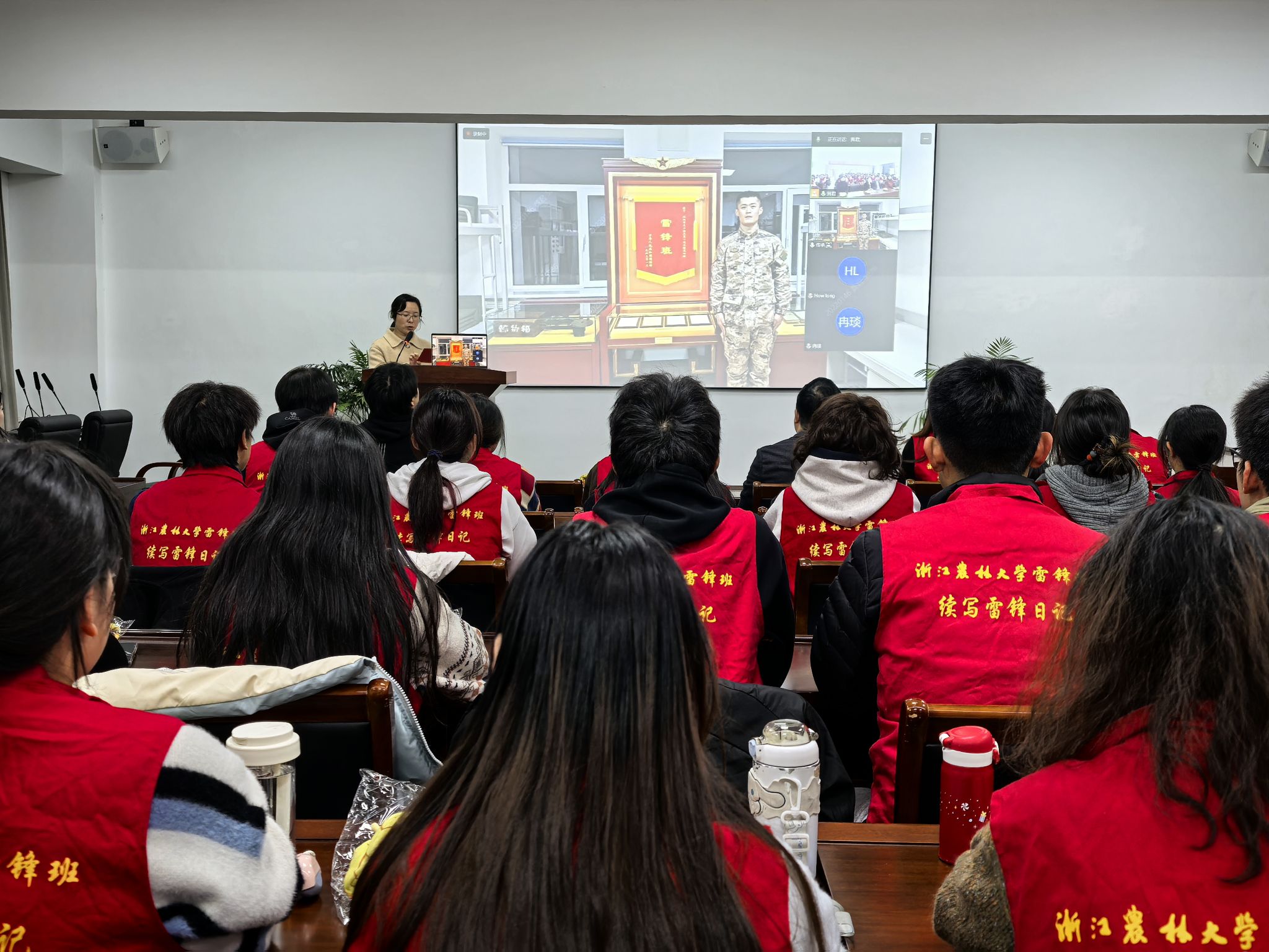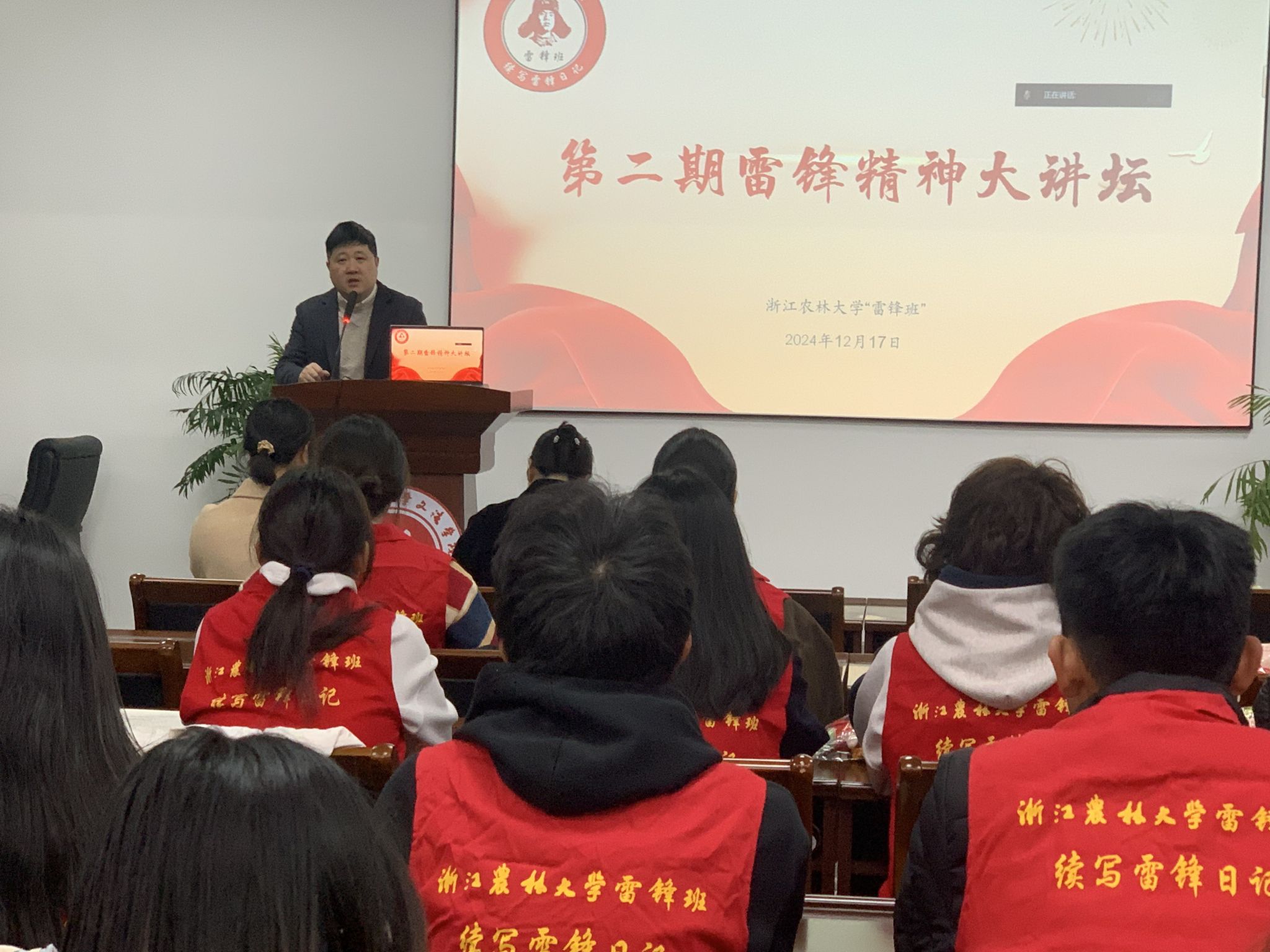 12月17日,浙江农林大学“雷锋班”邀请雷锋生前所在部队在实验大楼502开展题为“感悟雷锋精神真谛 筑牢立身做人根基”的第二期雷锋精神大讲坛。雷锋班第27任班长牟振华中士受邀主讲,文法学院相关负责人、雷锋班指导老师、浙江农林大学“雷锋班”全体成员、各党支部党员代表参加活动。