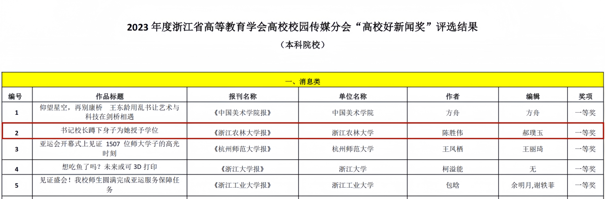2023年度,我校共有四件新闻作品获奖。其中《书记校长蹲下身子为她授予学位》获消息类一等奖,《浙江农林大学报》2023年10月31日第697期第02.03版、2023年12月31日第699期第04版、2023年12月31日第699期第03版分别获版面类三等奖。