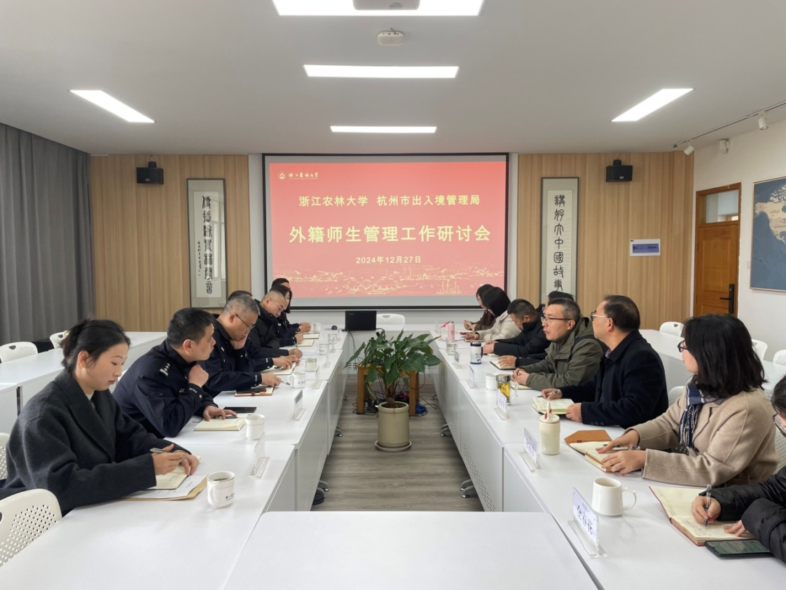 12月27日,杭州市公安局出入境管理局副局长金晓明一行来校调研指导我校外籍师生管理工作,杭州市公安局临安区分局副局长罗雪峰,临安区出入境管理科相关同志陪同调研。我校国际处、保卫处相关负责人,国际教育学院(孔子学院)班子成员、相关管理人员参加会议。