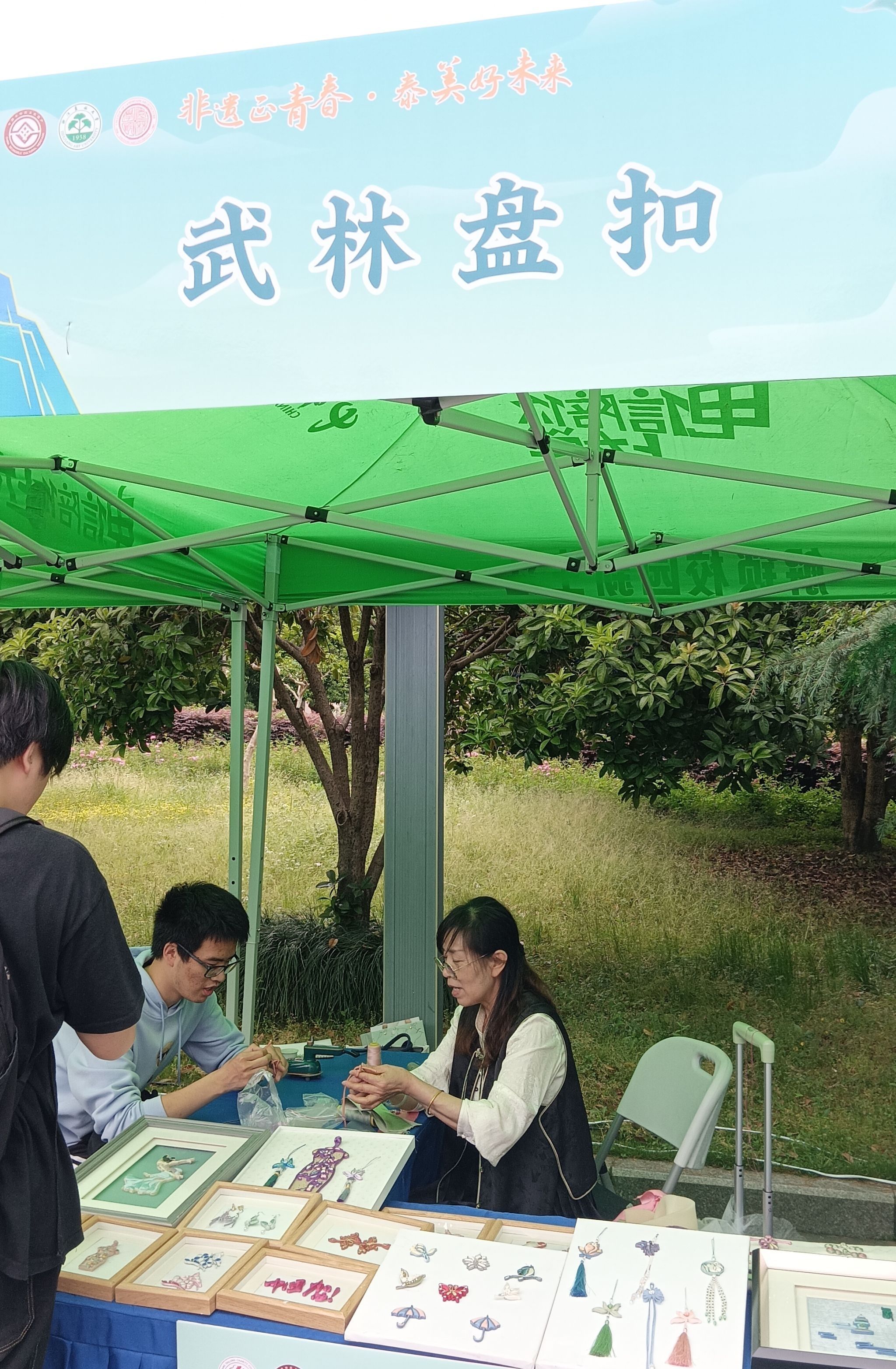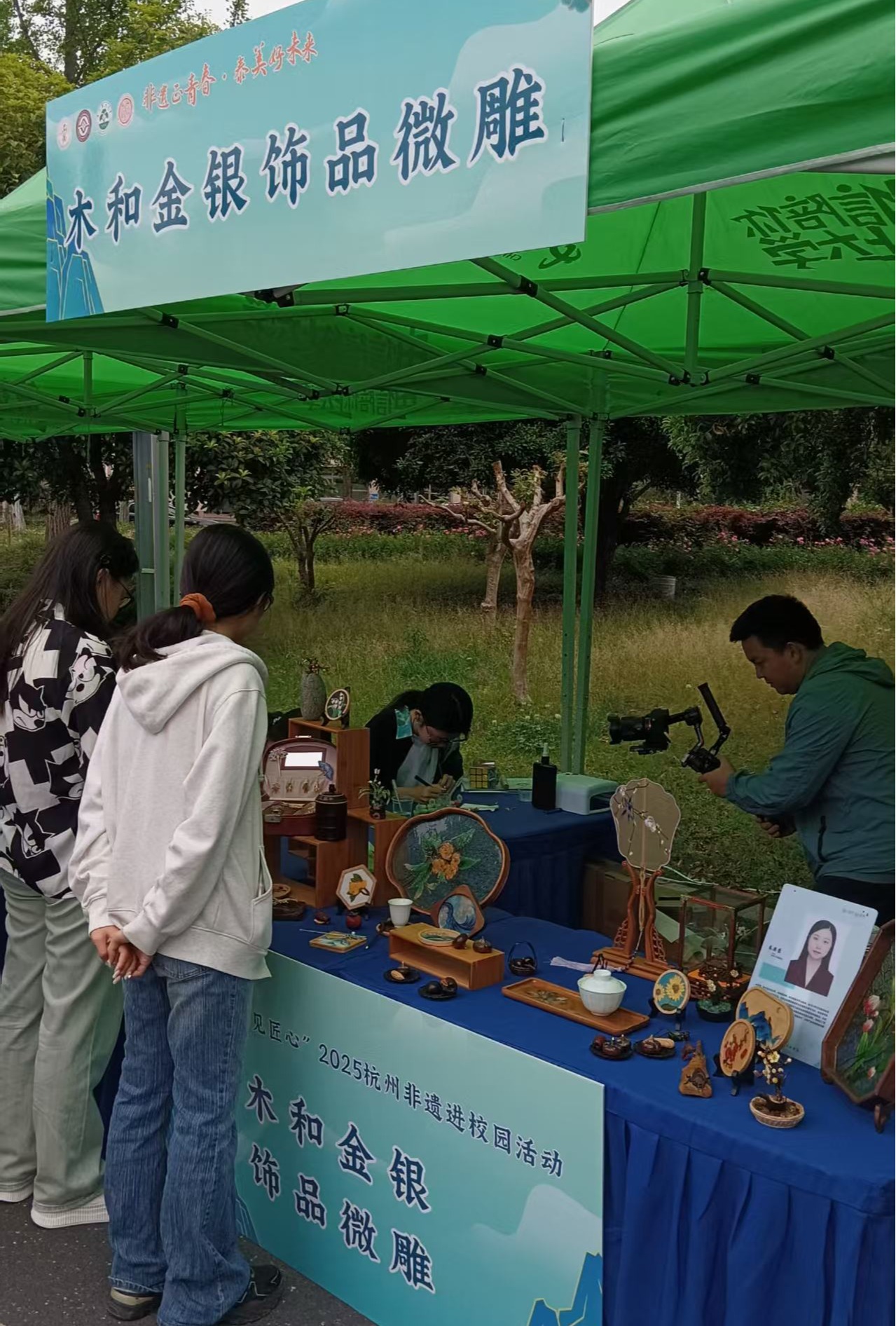 活动现场,设有杭州小热昏、泥人、剪纸、面塑、糖塑、五柳雅扇、武林盘扣、微型木雕、蓝印花布印染技艺、古法艾灸等15个非遗项目和传统舞蹈、中国茶艺、叠石技术、插花艺术4个学生艺展。各展位的非遗传承人及作品齐聚,大家各展其能,小热昏的锣声、艾草的香味、浓郁的红茶、精美的盘扣等,好看、好玩、好闻、好听,吸引了近千名师生驻足体验,进一步激发了大学生群体对非物质文化遗产的浓厚兴趣。