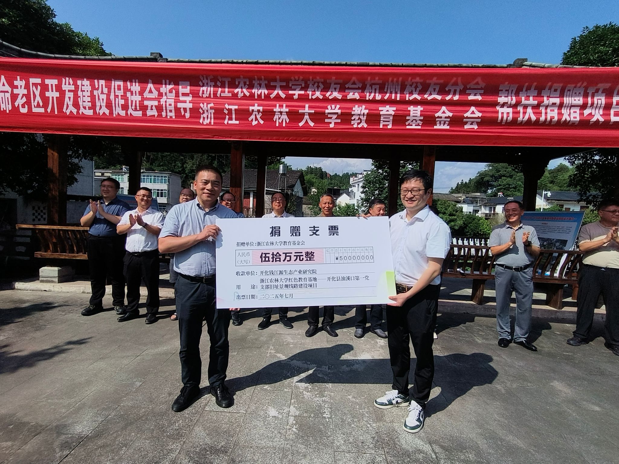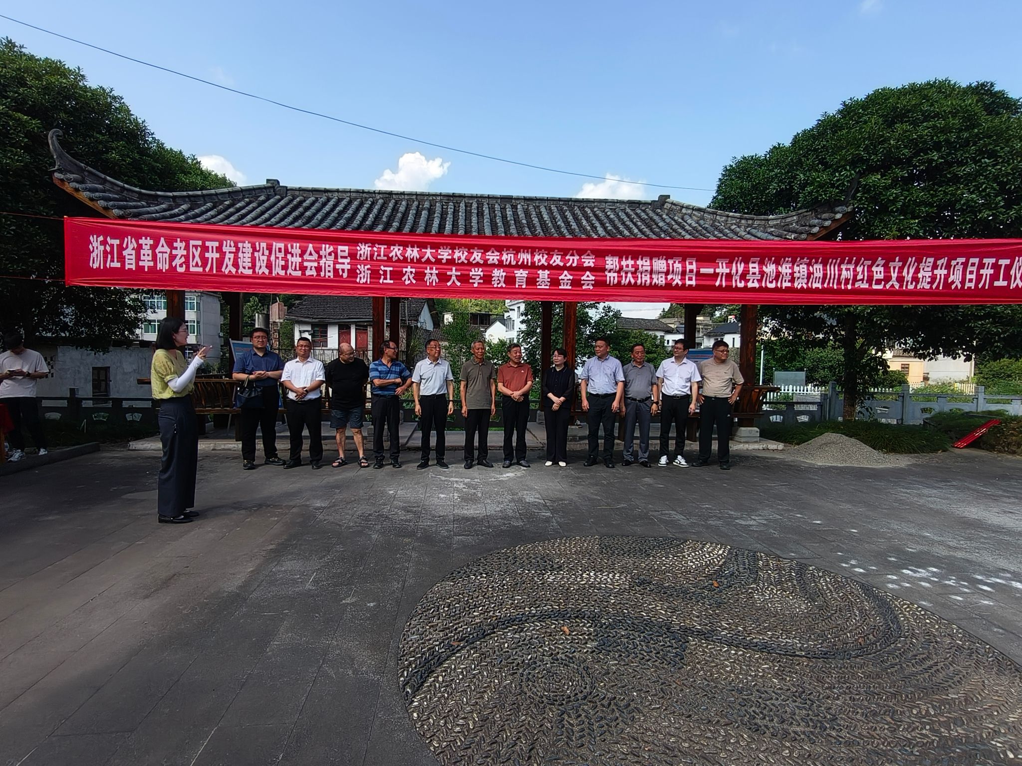 7月 14 日,浙江农林大学红色教育基地——开化县油溪口第一党支部旧址景观线路建设项目开工仪式在开化县举行。原浙江广播电视大学党委书记、学校校友会杭州校友分会会长方志刚,浙江省革命老区开发建设促进会副会长吴金良,学校校友办主任、基金会秘书长哀建国,开化县人大常委会副主任邹志岗、副县长周晓燕出席开工仪式。