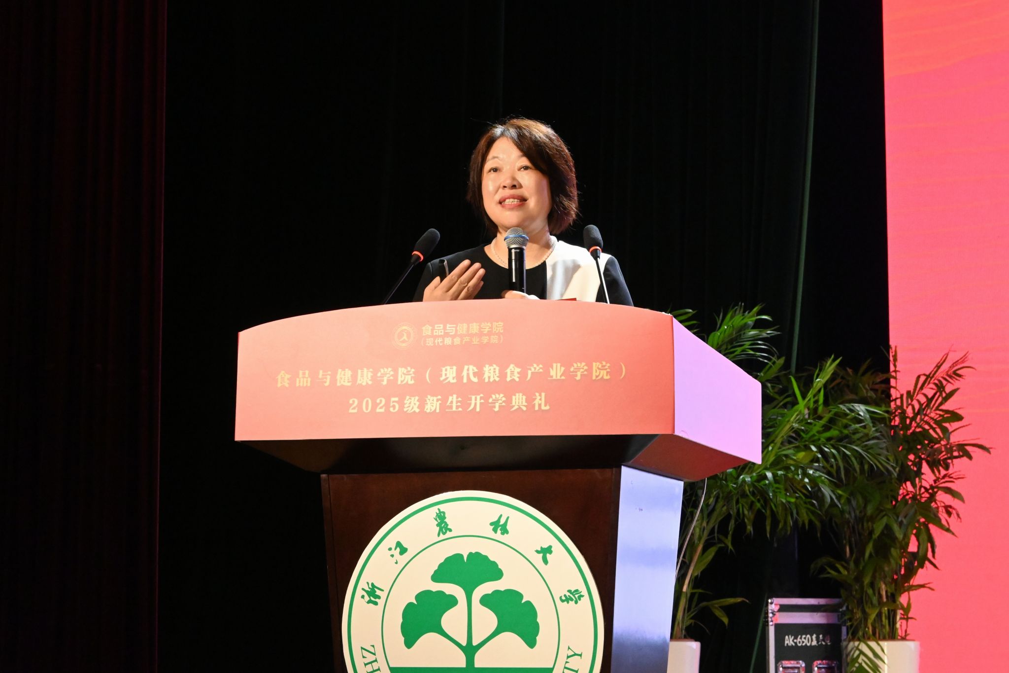 开学典礼仪式后,闵伟红为全体新生讲授主题为“粮安天下,健康中国”的“院长第一课”。她就学校与学院的发展历程、学科专业特色、人才培养模式、师资力量以及科研平台建设等方面的建设情况,向同学们做了详细介绍。闵院长对2025级新生提出“五点希望”:一是要提升学术抱负,主动深耕专业领域、参与科研实践;二是要兼顾身心发展,积极培养体育爱好,在运动中锤炼意志、释放压力;三是注重艺术修养的培育,通过欣赏展览、学习乐器等丰富精神世界;四是坚持阅读经典,在文字中拓宽视野;五是用心结交知心好友,在互助同行中收获温暖,寄语所有青年学子要为“健康中国”和“全民健康”努力奋斗。
