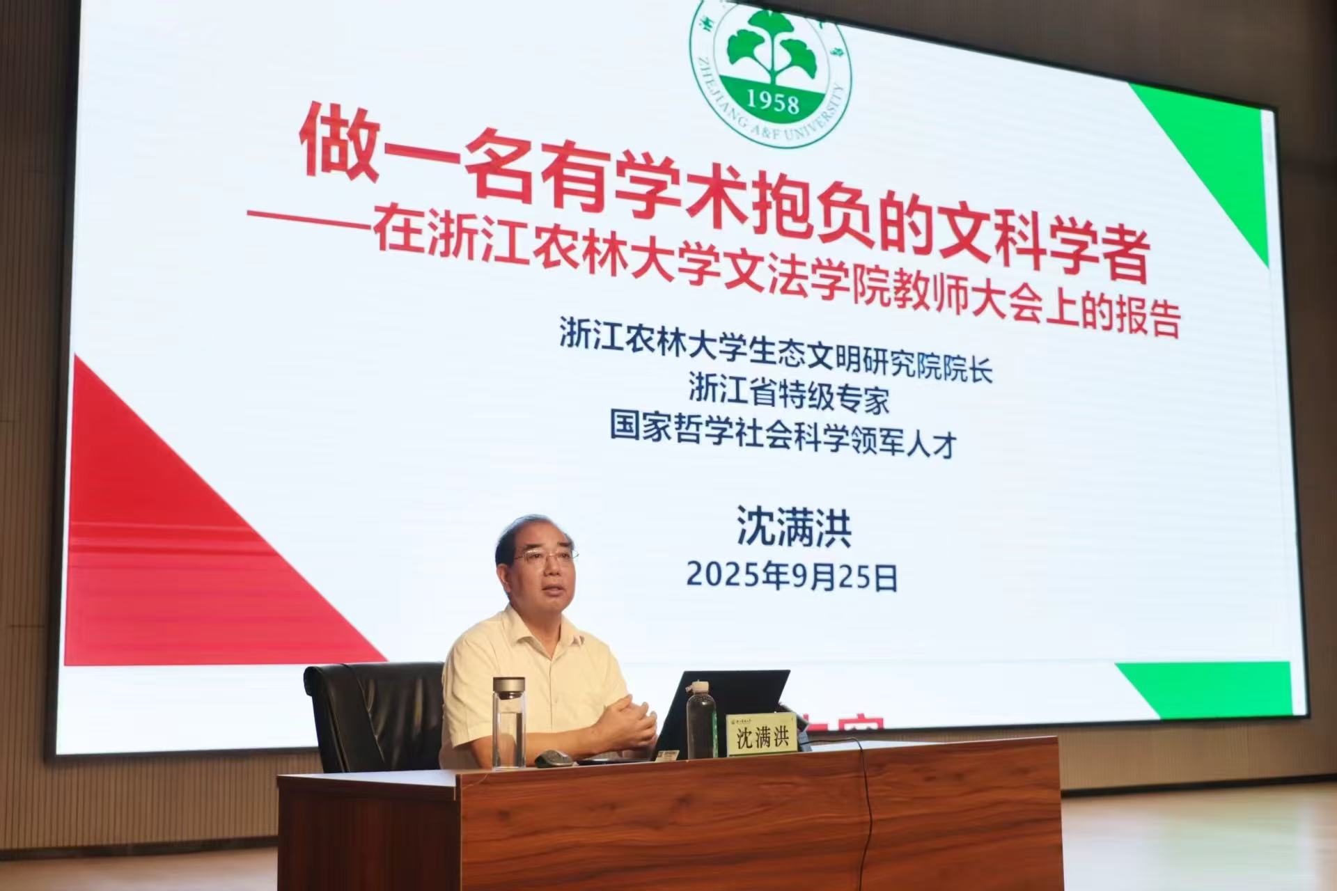 会议特邀学校原党委书记、浙江农林大学生态文明研究院院长沈满洪教授,面向全院教职工作《做一名有学术抱负的文科学者》辅导报告,他分享了自己在文科科研道路上攻坚克难的宝贵经验与体悟,激励文法教师在文科科研进步的道路上不断勇攀高峰。