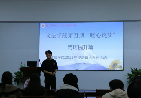 12月22日至25日,文法学院举办“暖心筑梦”系列资助育人活动。活动涵盖职场形象、简历提升、求职心理、职场法律四大核心板块,为受助学子搭建全方位、立体化的求职支持平台。