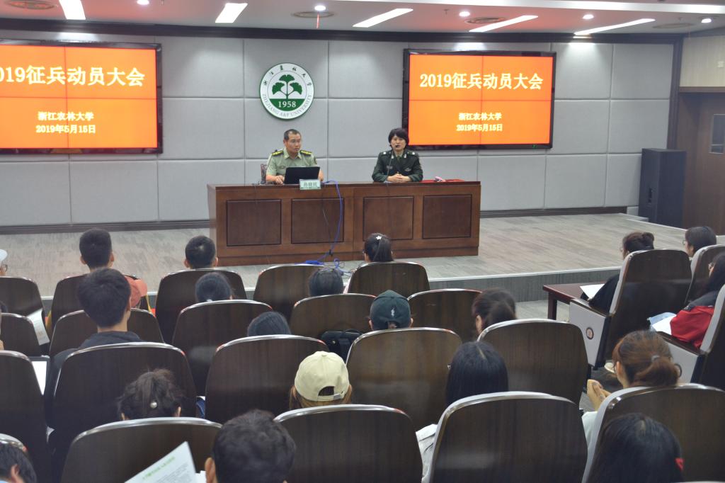 “投笔从戎、报效祖国”,5月15日,学校2019年大学生应征入伍动员宣传大会在图书馆第二报告厅召开。动员大会由人武部相关负责人主持。来自各学院的180余名学生参会。