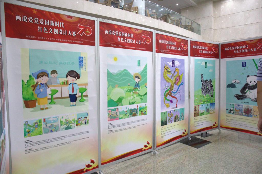 为讴歌建党98周年、喜迎新中国成立70周年,近日由校党委组织部、宣传部、艺术设计学院党委共同主办的“喜迎新中国成立70载·画说爱党爱国新时代”红色文化创意优秀作品展在图书馆报告厅前进行展出。