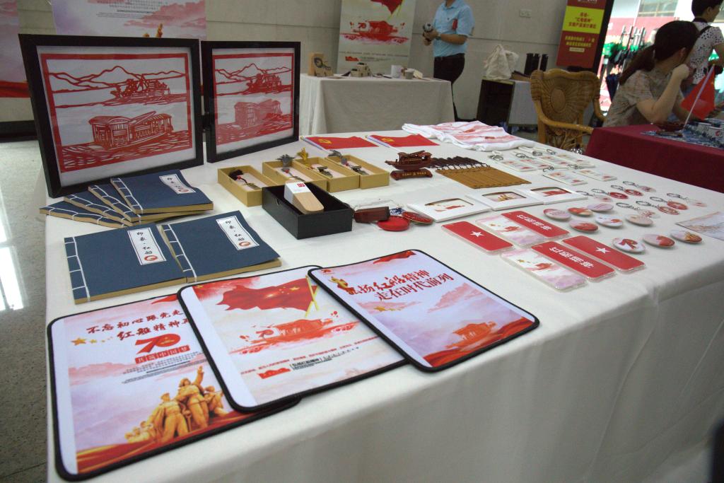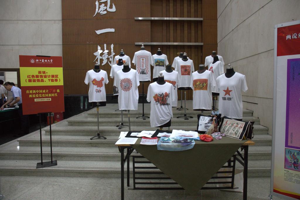 此次展出的作品将红色主题与学生的文化创意创作相融合。作品有画说+社会主义核心价值观插画设计;画说+“红船精神”文创设计;画说+红色主题摄影作品;画说+红色主题新媒体作品(VR作品,微视频等);画说+红色服饰设计(服装饰品、T恤等)五个版块组成。本次活动经前期精心组织和广泛动员得到了全校师生党员的积极参与,活动共征集作品100余组,近200多学生参与其中,经过专家老师和学生代表的精心挑选,最终选出33组优秀作品进行展出。
