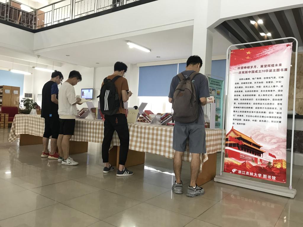 在喜迎新中国成立70周年之际, 9月18日,回望峥嵘岁月,展望辉煌未来——庆祝新中国成立70周年主题书展在衣锦图书馆二楼大厅展出。