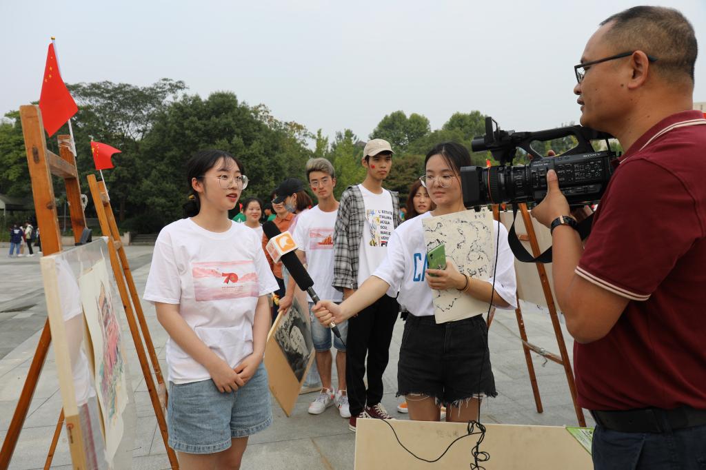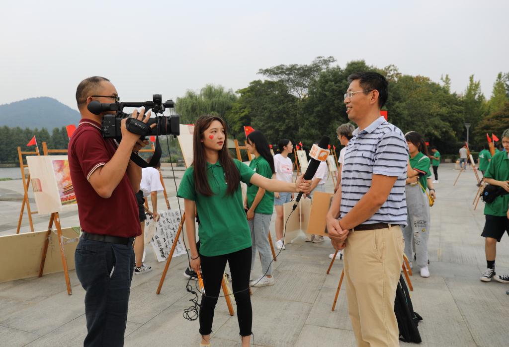 金秋九月,国庆前夕,学校东湖畔国旗飞扬。9月26日,学校开展“向祖国献画,庆祝新中国成立70周年”活动。我国著名的书画家,美术教育家、诗人叶尚青与70位19级艺术设计学院学子绘绿水青山,向祖国母亲献礼。活动吸引了临安电视台等多家媒体关注报道。