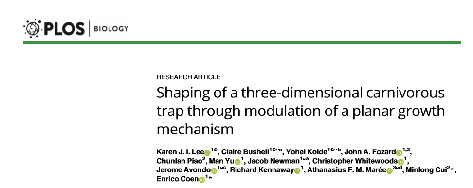 近期,农业与食品科学学院崔敏龙教授与英国约翰•英纳斯中心(John Innes Centre)Enrico Coen教授研究团队在水生食虫植物丝叶狸藻(Utriculariagibba)的捕虫器【杯状叶或陷阱(trap)】生长发育机制研究方面取得重要进展。研究成果以“Shaping of a three-dimensional carnivorous trap through modulation of a planar growth mechanism”为题在《PLoS Biology》上发表,崔敏龙和Enrico Coen为共同通讯作者,朴春兰为参与者;另一篇以“Evolution of carnivorous traps from planar leaves through simple shifts in gene expression”为题在《Science》上发表,崔敏龙和朴春兰为参与者。