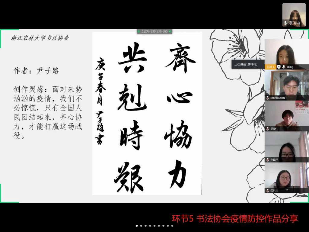 活动中,同学们还纷纷展示出自己精心创作的疫情防控宣传作品,共同为武汉助力、为中国加油,“新农人”校内外学员代表分享了抗击战疫的心得体会,充分展现了浙农林青年团结一致共同抗疫的决心和信心。