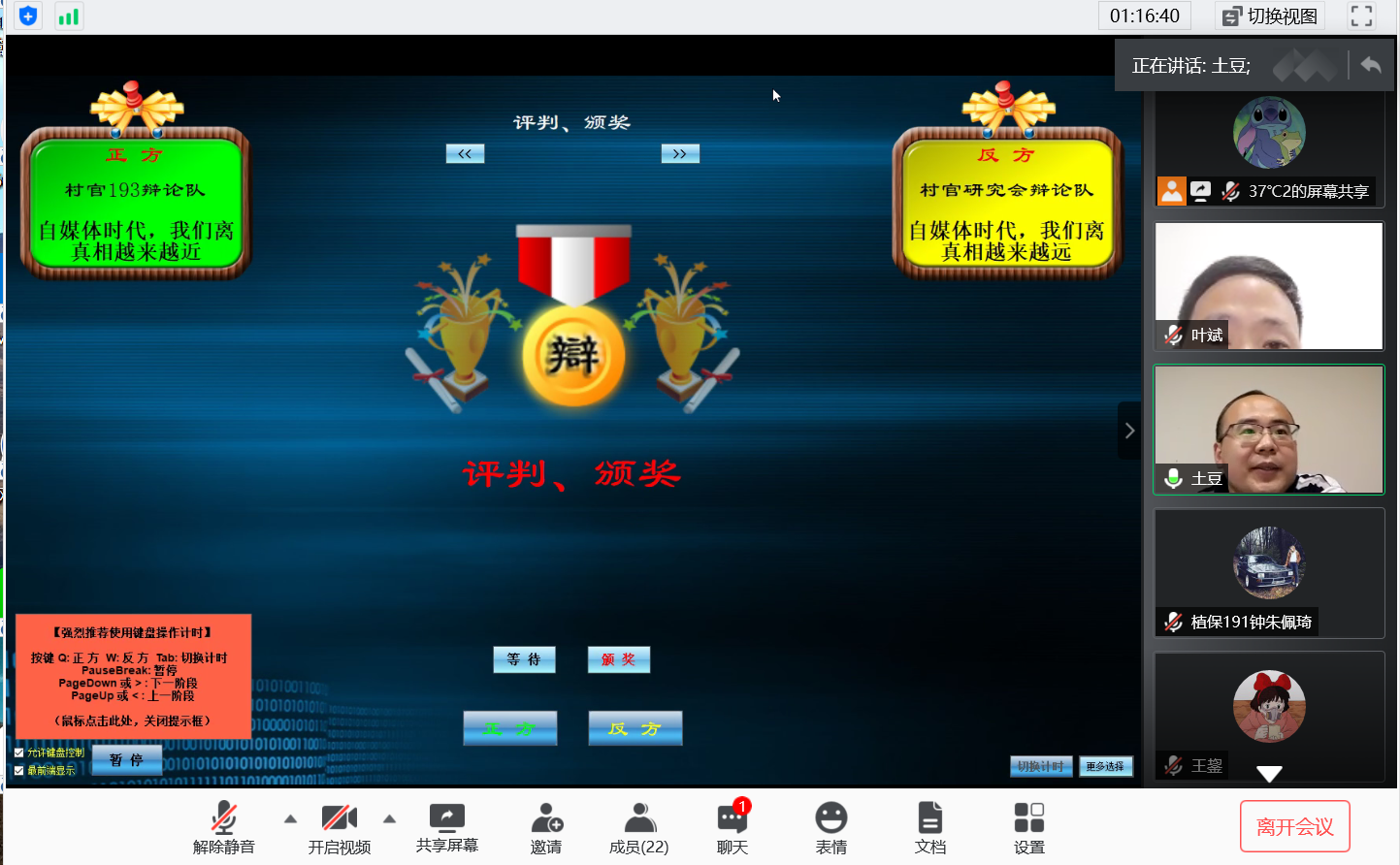 在初赛阶段,双方辩手以“战斗在前线的医务人员的子女们是否应该享有升学考试的优惠”和“通才和专才哪个更好”为辩题进行辩论。复赛环节,以“网课学习是利大于弊还是弊大于利”为辩题,对决队伍旁征博引,相互进行了激烈的交锋,现场气氛活跃。在两场激烈的角逐之后,辩论赛二强进入扣人心弦的决赛环节,以“自媒体时代,我们离真相越来越近还是越来越远”为辩题,参赛队伍乘风破浪,气势如虹,自由辩论环节将比赛气氛再次推向高潮。经过激烈的比赛和评委们公正的评判,村官193班代表队摘得桂冠,村官研究会代表队获得亚军。