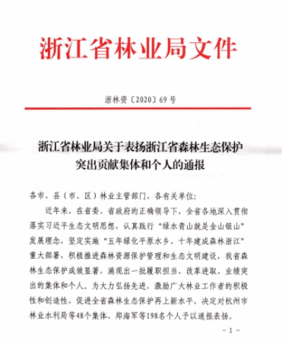 据悉,本次“浙江省森林生态保护突出贡献集体和个人”通报表扬活动,评选对象为全省范围在森林生态保护方面成绩显著的单位或者个人,共有浙江省森林生态保护突出贡献集体50个,浙江省森林生态保护突出贡献个人200名。