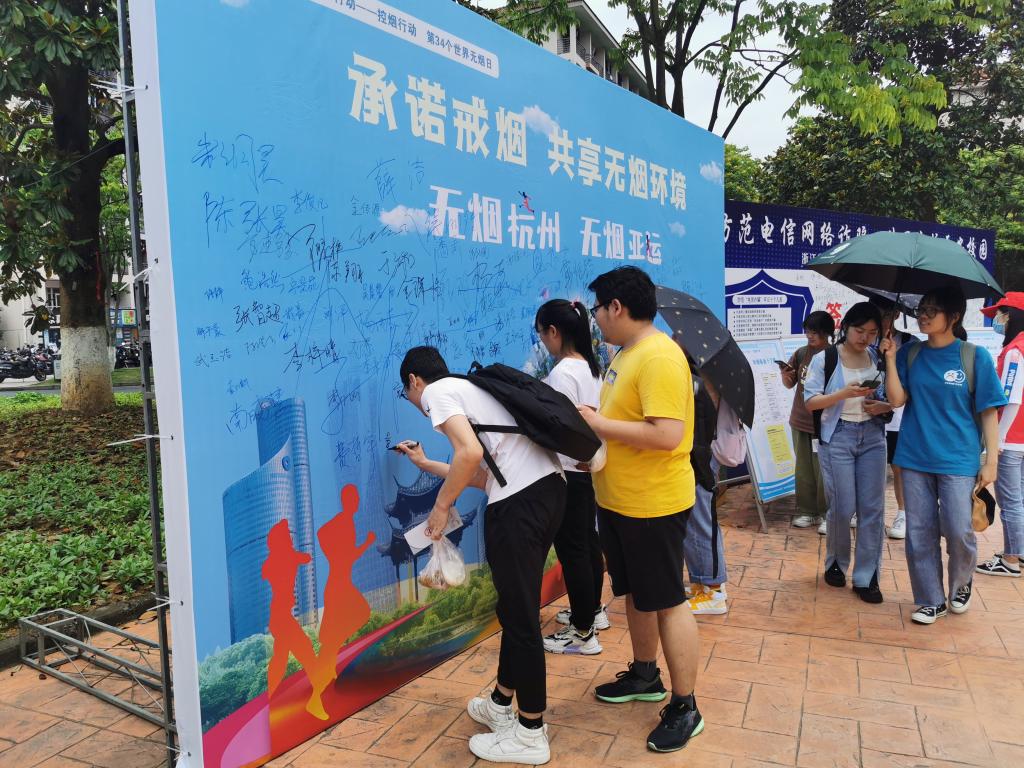 5月31日,为贯彻落实《健康中国行动(2019-2030年)》控烟行动有关要求,在2021年第34个世界无烟日来临之际,学校与临安区疾病预防控制中心、杭州市临安区第一人民医院,在东湖校区联合开展世界无烟日系列宣传活动。