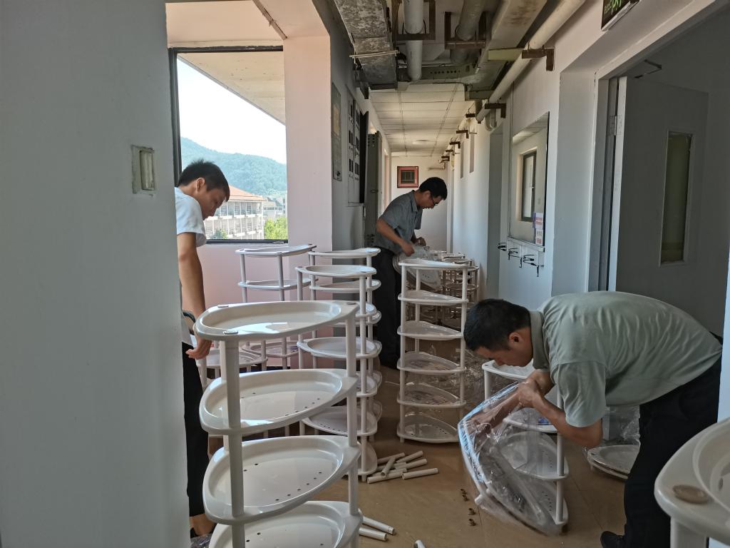 开学在即,A区学生公寓改造项目已进入尾声。为加快项目收尾工作,减轻修建中心工作压力,给入住新生提供设备齐全、整洁舒适的居住环境,后勤服务中心党委以支部为单位划分包干区,为新生宿舍安装脸盆架。各支部党员上午9:00准时到达公寓楼大厅集合,开始志愿劳动。大家自觉分配工作,拆封配对、支架安装、送架入寝,一切进行得有条不紊。经过近两个小时的协同作战,A区学生公寓脸盆架全部组装完毕。