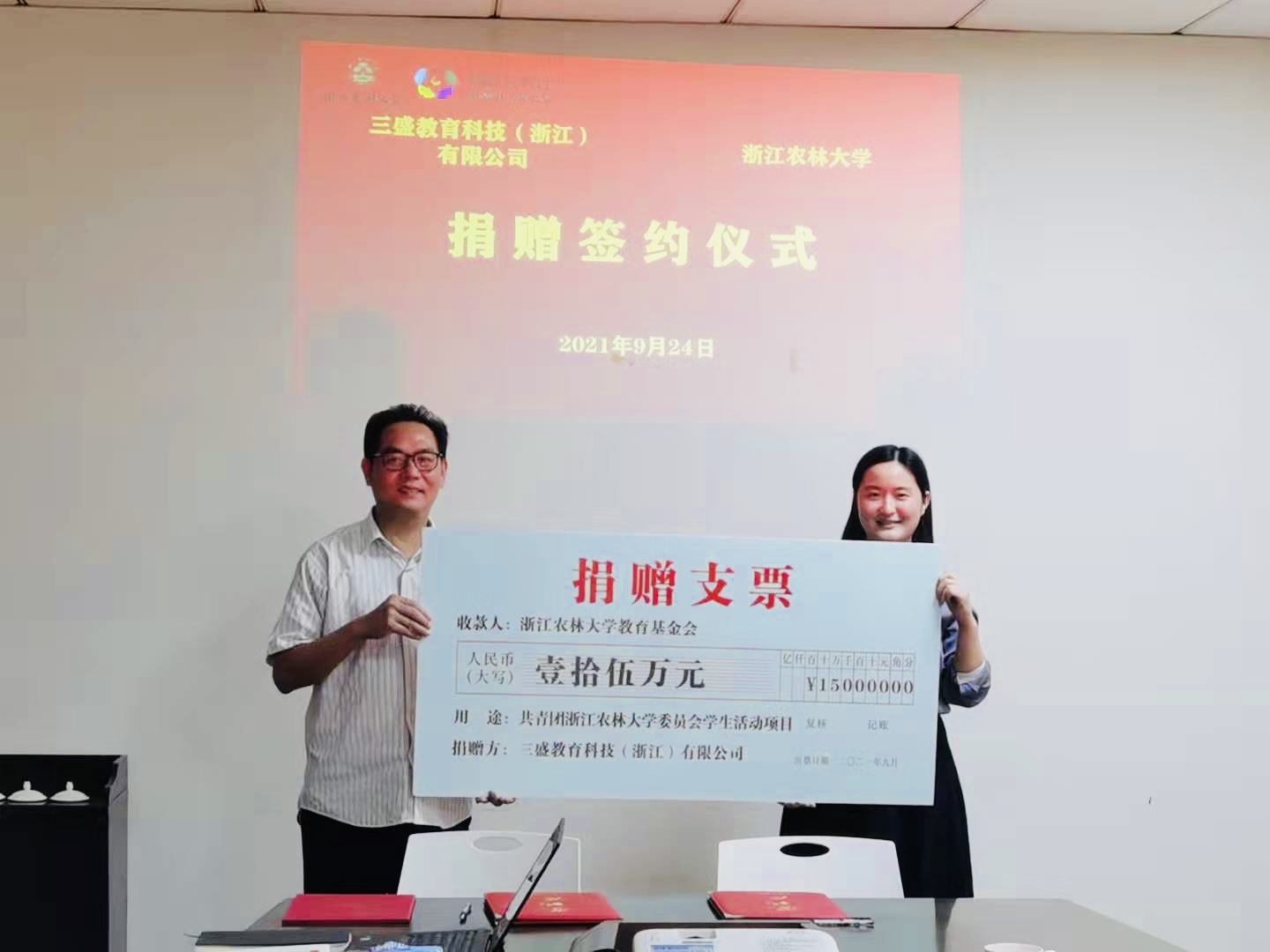 9月24日,校团委与三盛教育科技(浙江)有限公司捐赠协议签署仪式举行。三盛教育向校团委捐赠十五万元,支持学生素质拓展。三盛教育总经理钱小燕,学校校友办公室主任、教育基金会秘书长杨黎明出席仪式,校团委书记魏玲玲主持仪式。