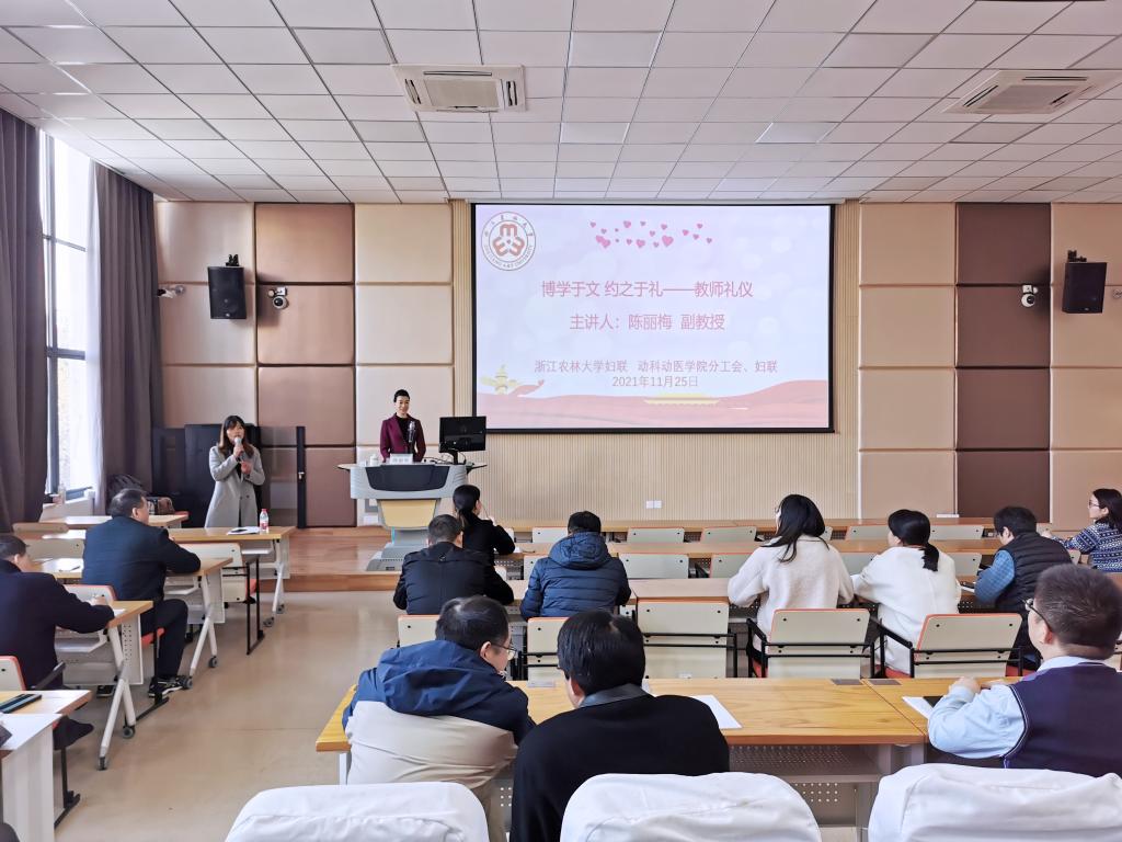 为深化师德师风建设,提升教师文明礼仪素养,动科动医学院邀请了高级国际礼仪师、浙江旅游职业学院空乘专业副教授陈丽梅来校作“博学于文 约之于礼—教师礼仪”培训讲座。校工会、妇联相关负责人,动科动医学院全体教职工参加培训。