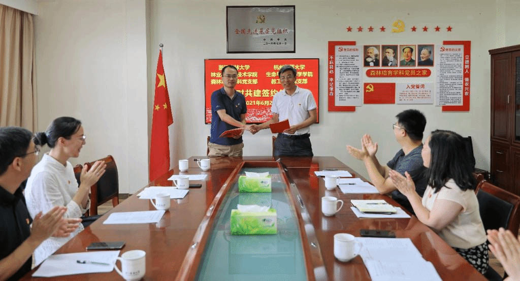 6月25日,为认真落实新时代党的建设总要求,探索建立健全保持党员先进性长效性机制的有效途径和方法,森培学科党支部与杭州师范大学生科院教工第三党支部开展结对共建活动。林生院党委书记郑炳松主持本次活动。