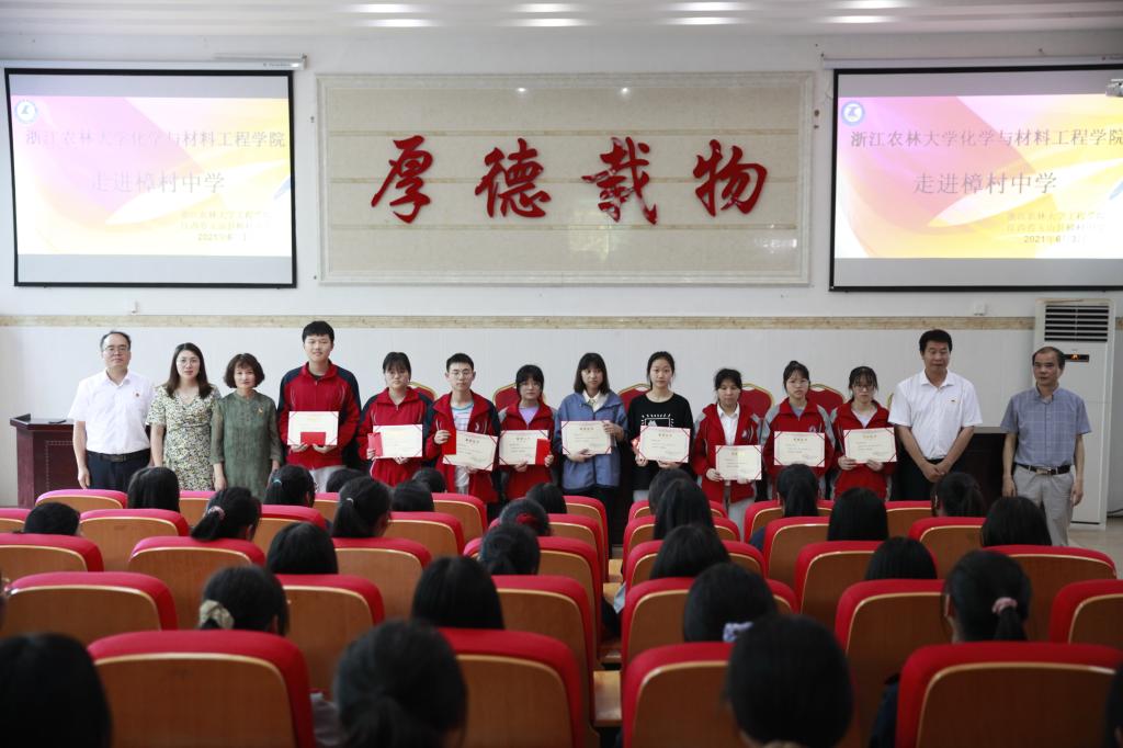 在玉山县樟村中学礼堂内,樟村中学徐校长深情讲述了林业工程学科党支部与樟村中学的“樟中情愫”。谢志新表达了对樟村中学学子的美好祝福及期望。孙庆丰以习近平的七年知青岁月、陈望道翻译《共产党宣言》时“蘸着墨汁吃粽子,还说味道很甜”的故事为例,告诫同学们珍惜时间,多读书、读好书、好读书。谢书记和孙庆丰一同为樟村中学第三届“林工励志奖学金”获得者颁奖。学院相关负责人为同学们作《择校选专业:走好青春求学之路》升学辅导报告。