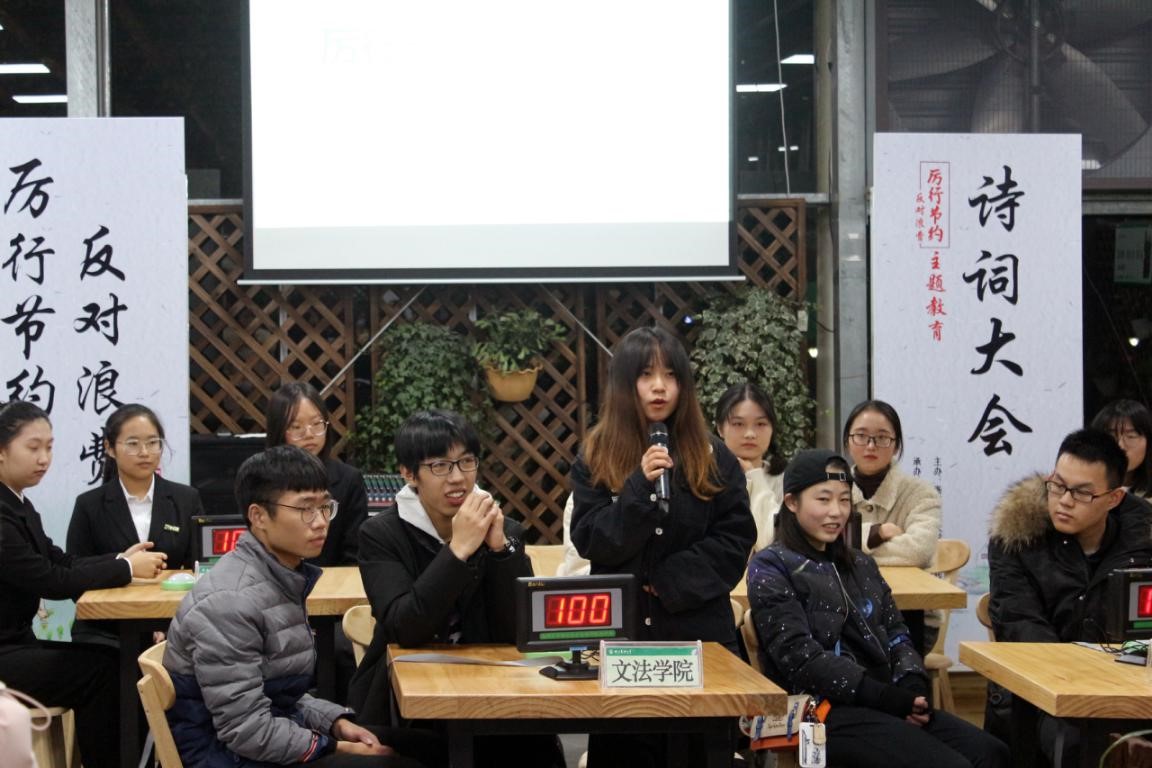 整场比赛分为“聚沙成塔”、“争分夺秒”和“绿”“水”“青”“山”令三个环节,采用问答和抢答的形式对参赛选手进行考验。各学院选手展现出了良好的文学素养和对节俭精神的深刻理解,六组选手思维敏捷、踊跃抢答,观众们也积极参与到了互动中。经过一系列紧张激烈的角逐,最终文法学院代表队获得本次诗词大会一等奖,农学院和工程学院代表队获得二等奖,园林学院、动科动医学院和集贤学院代表队获得三等奖。活动中,文法学院听山艺术团带来的诗词吟唱和诗朗诵节目让同学们从另一种形式感受到诗词的魅力。