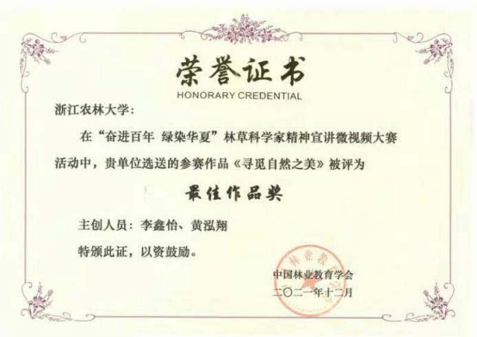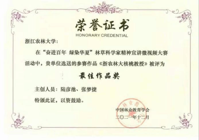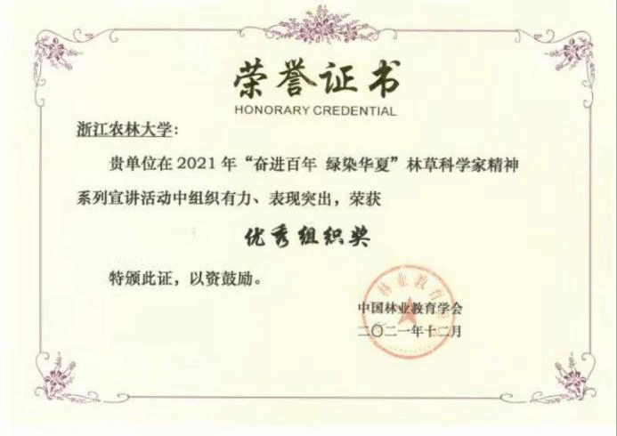 近日,由中国林业教育学会主办的“奋进百年 绿染华夏”林草科学家精神宣讲活动落下帷幕。我校获优秀组织奖,全国仅北京林业大学和我校获此殊荣。此外,我校作品《寻觅自然之美》和《浙农林大核桃教授》荣获“最佳作品奖”。