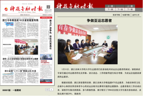 《杭州日报》和《科技金融时报》分别以题为“近3000人报名,录取比例不到1/4!农林大学子争当亚运义工”“争做亚运志愿者”对我校亚运会、亚残运会志愿者初选工作进行了报道,详细介绍了我校志愿者的报名情况和工作安排。