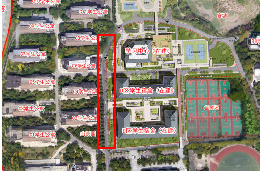 学生宿舍C2至C8东面道路,具体路段详见下图红框区域。
