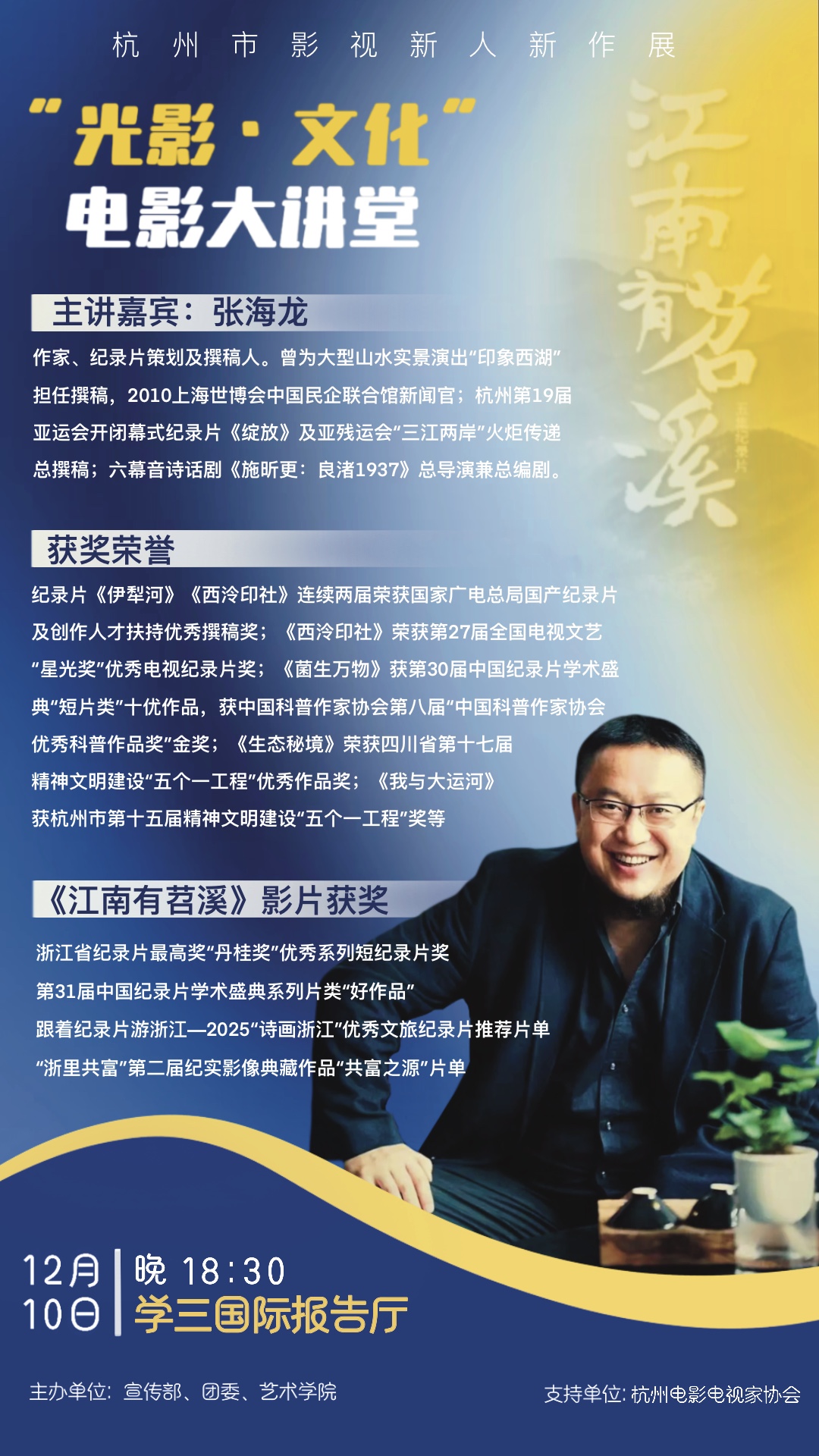 为了深入贯彻学校“无体艺 不农林”的战略要求,丰富学生校园文化生活,促进艺术交流与学习,浙江农林大学党委宣传部、校团委、艺术设计学院联合举办“光影·文化”电影大讲堂活动。本次电影大讲堂是“杭州市电影新人新作展”特别展映活动之一,旨在发现、扶持、团结、引领青年优秀影像创作者,激活杭州影视创作活力,推动杭州影视内容高质量发展。活动特邀著名作家、纪录片策划及撰稿人张海龙先生担任主讲嘉宾,分享其艺术创作经验与心得,与师生探讨影像艺术魅力。