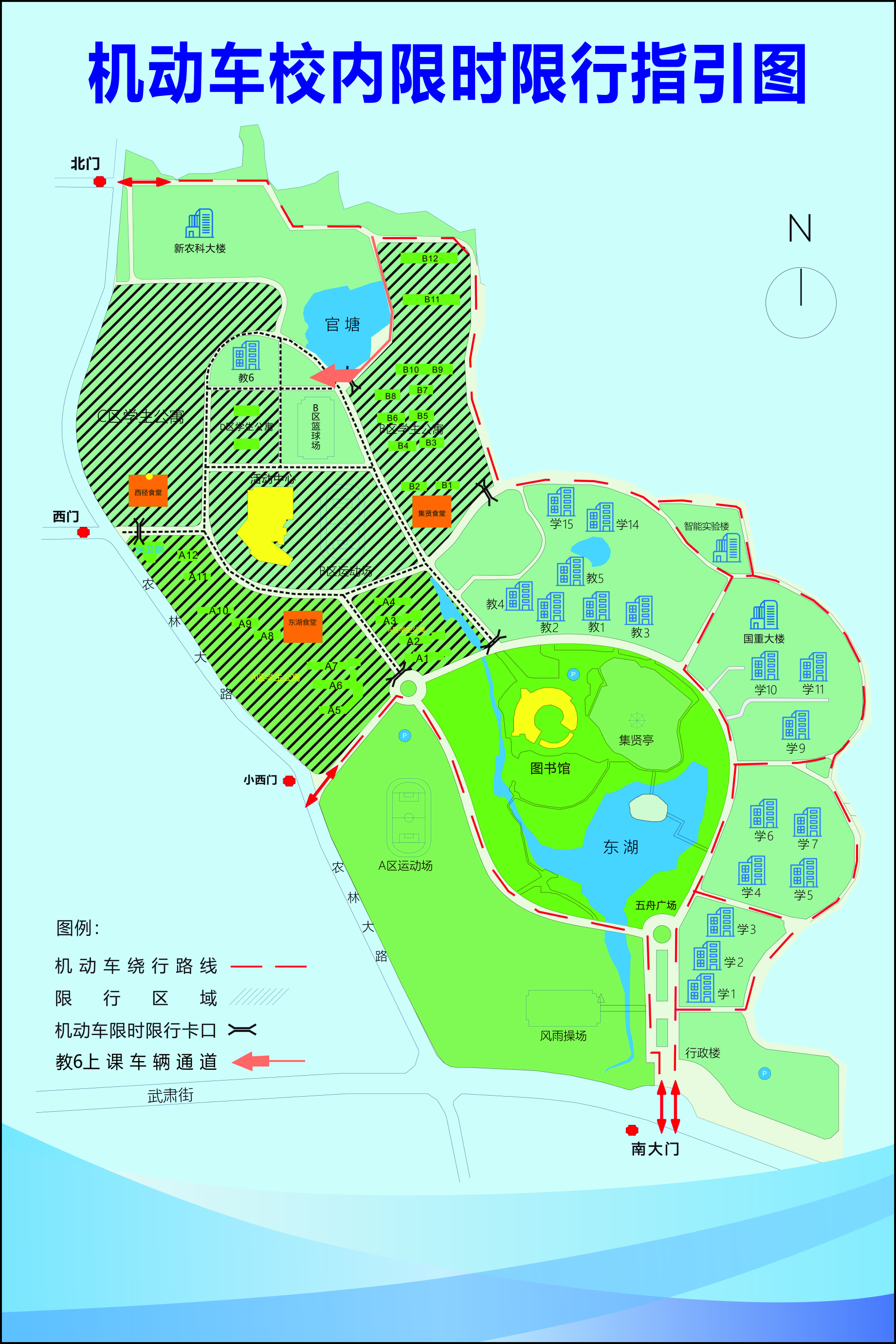 工作日上下课高峰时间段(冬令时 7:40-8:00、9:30-9:50、11:30-11:50、13:10-13:30、15:00-15:20,夏令时 7:40-8:00、9:30-9:50、11:30-11:50、13:40-14:00、15:30-15:50),东湖校区A、B、C、D区学生寝室与教学楼之间主要道路禁止机动车驶入(教6上课教师车辆可经B8西侧路口驶入教6地下停车场)。