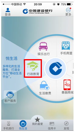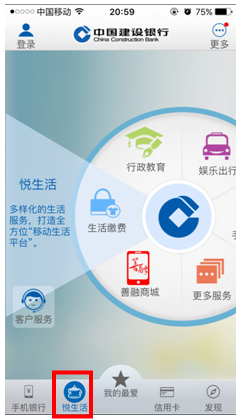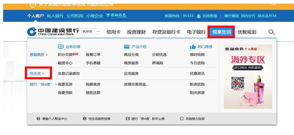 第一步,登录建行网站(www.ccb.com),选择“悦享生活”,并点击“悦生活”按钮: